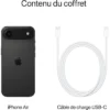 | Fonctions supplémentaires | Bouton d'action : accessibility, appareil photo, controls, lampe de poche, focus, loupe, recognize music, shortcut, silent mode, translate, visual intelligence, mémo vocal. Auto focus. Cuisson automatique et intelligente du riz. Assistance routière. Géolocalisation. Fonctions d'accessibilité : assistivetouch, sous-titres codés, eye tracking, live captions, live speech, loupe, personal voice, texte en temps réel (RTT), contenu oral, switch control, teletype (TTY), type to siri, vocal shortcuts, commande vocale, voiceover, zoom. Moteur photonique. Fusion profonde. Éclairage de portrait. Réduction du bruit du vent. Mode ralenti. Vidéo QuickTake. Partage d'écran. |