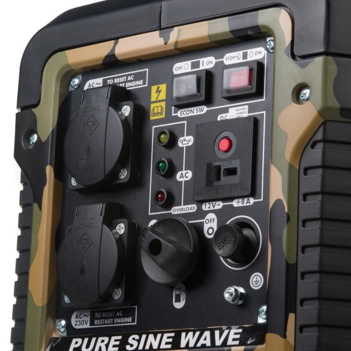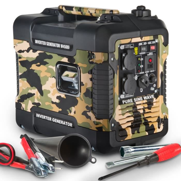 | Informations complémentaires | Dans la boite: 1 x générateur onduleur 1 x manuel d'utilisation 1 x pinces de charge DC 1 x outil de bougie d'allumage 1 x bougie d'allumage trop poignée 1 x tournevis 1 x entonnoir de carburant 1 x chapeau de pistolet noir |