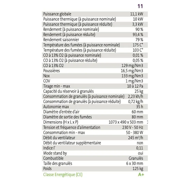 | Informations complémentaires | Le Volume de Chauffe est une donnée fournie à titre indicatif et ne remplace en rien les résultats d’une étude thermique précise de votre logement. Un des paramètres les plus importants étant notamment son isolation. Le Rendement indiqué est le rendement à puissance réduite. |