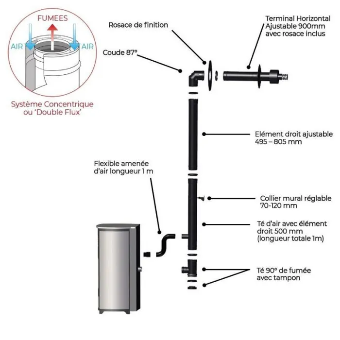 Les conduits concentriques double flux sont fournis sans joints (hormis pour le té de fumée) car ils sont titulaires du marquage CE selon les normes NF EN 14989-2 et NF EN 1856-2