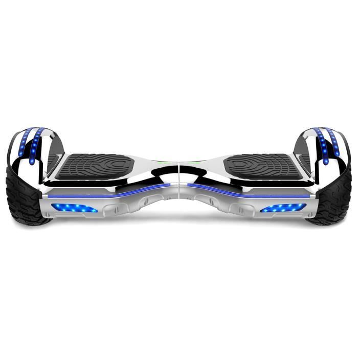 Puissance de 700 W et deux roues de 6,5″. Système gyroscopique intégré. Batterie ignifugé 4,4Ah 36V. Charge maximum : 120 kg. Equipé de LED pour la visibilité dans le noir. Roue de lumière. Vitesse max : 15 km/h. Bluetooth pour Android et IOS.